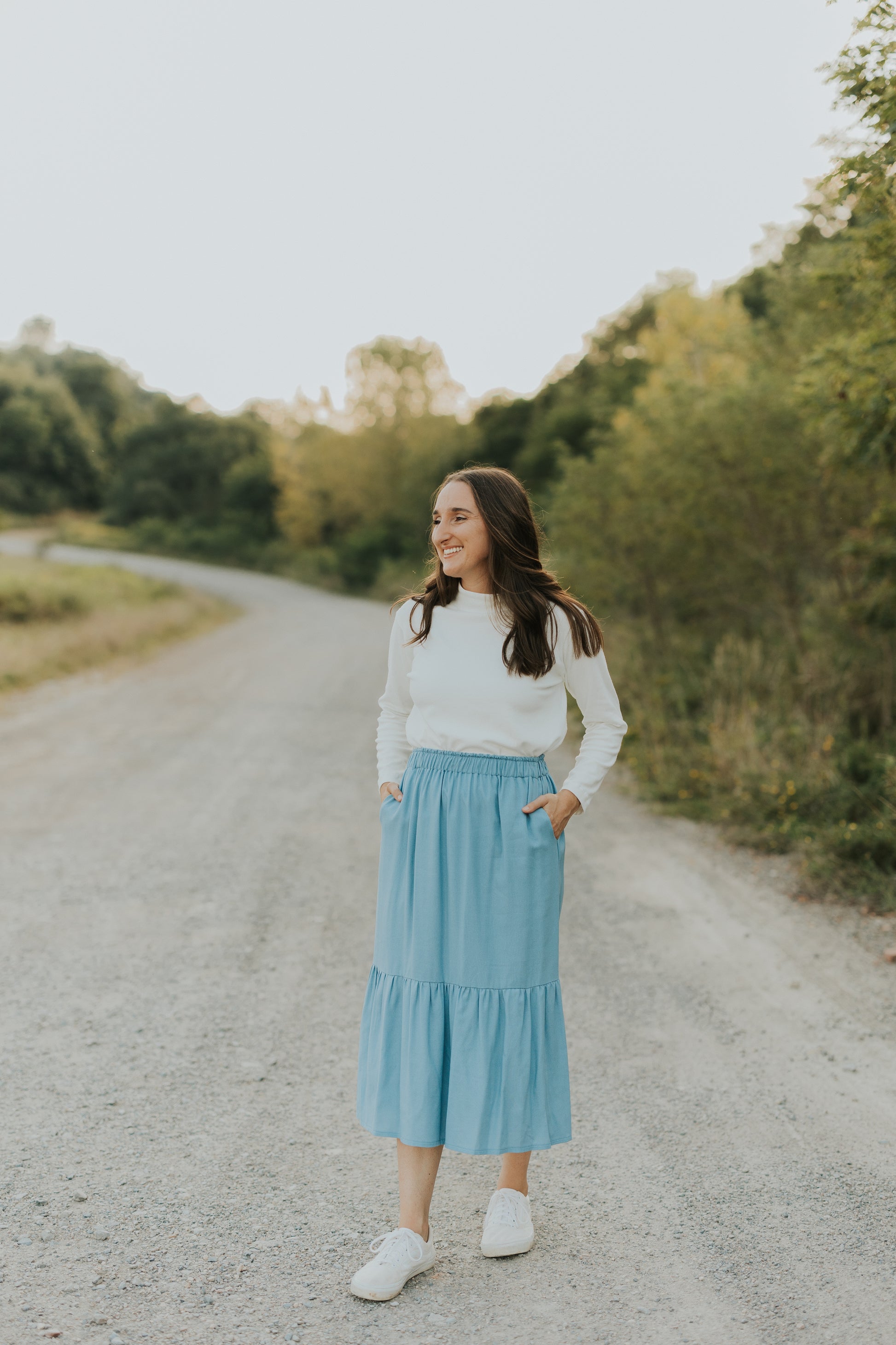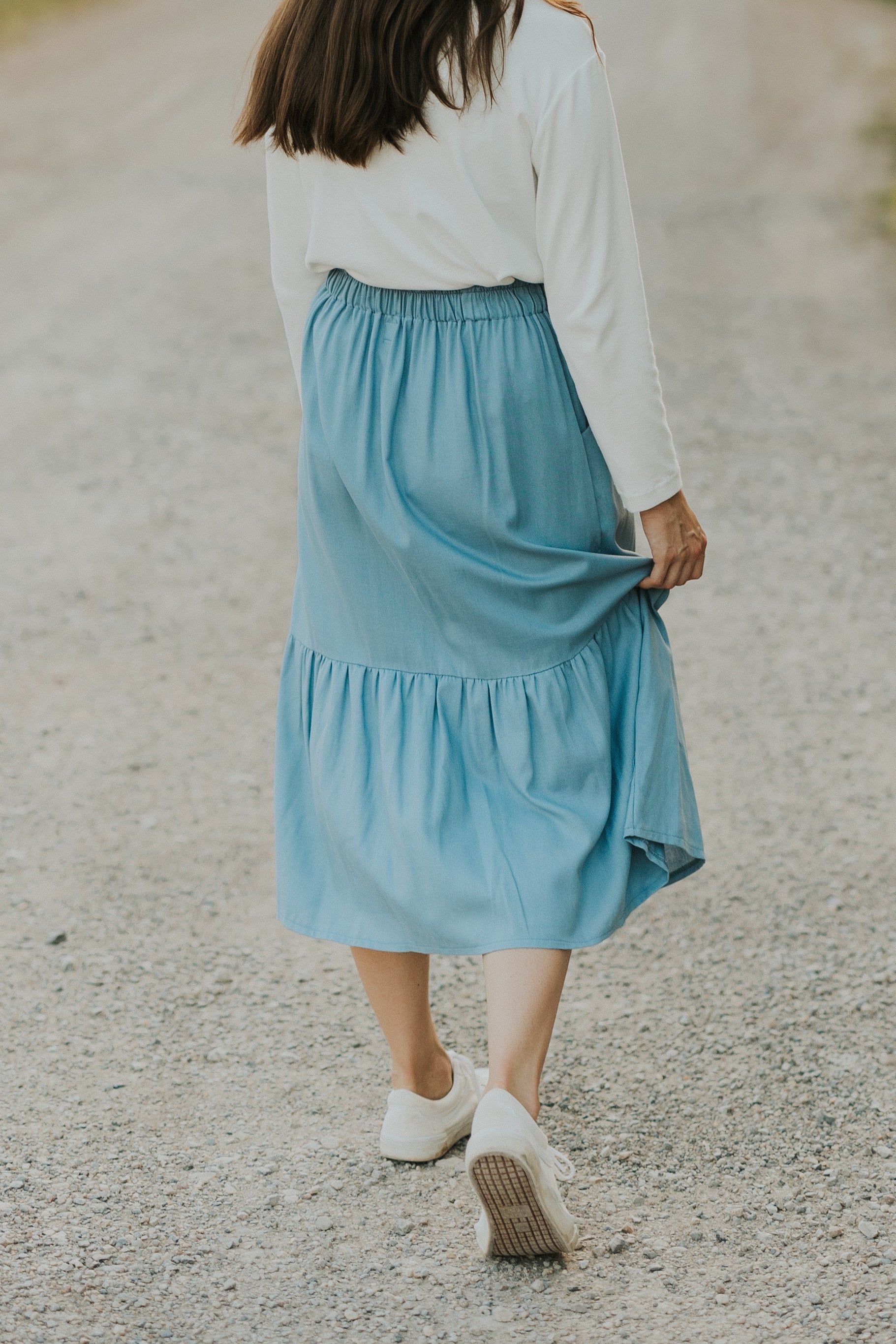 Introducing the Daisy Skirt: made from lightweight linen for a soft, breezy feel. In a lovely soft blue, it boasts a comfortable elastic waistband and functional pockets for all your essentials. Comfort and style in one package - you'll wear it everywhere!
