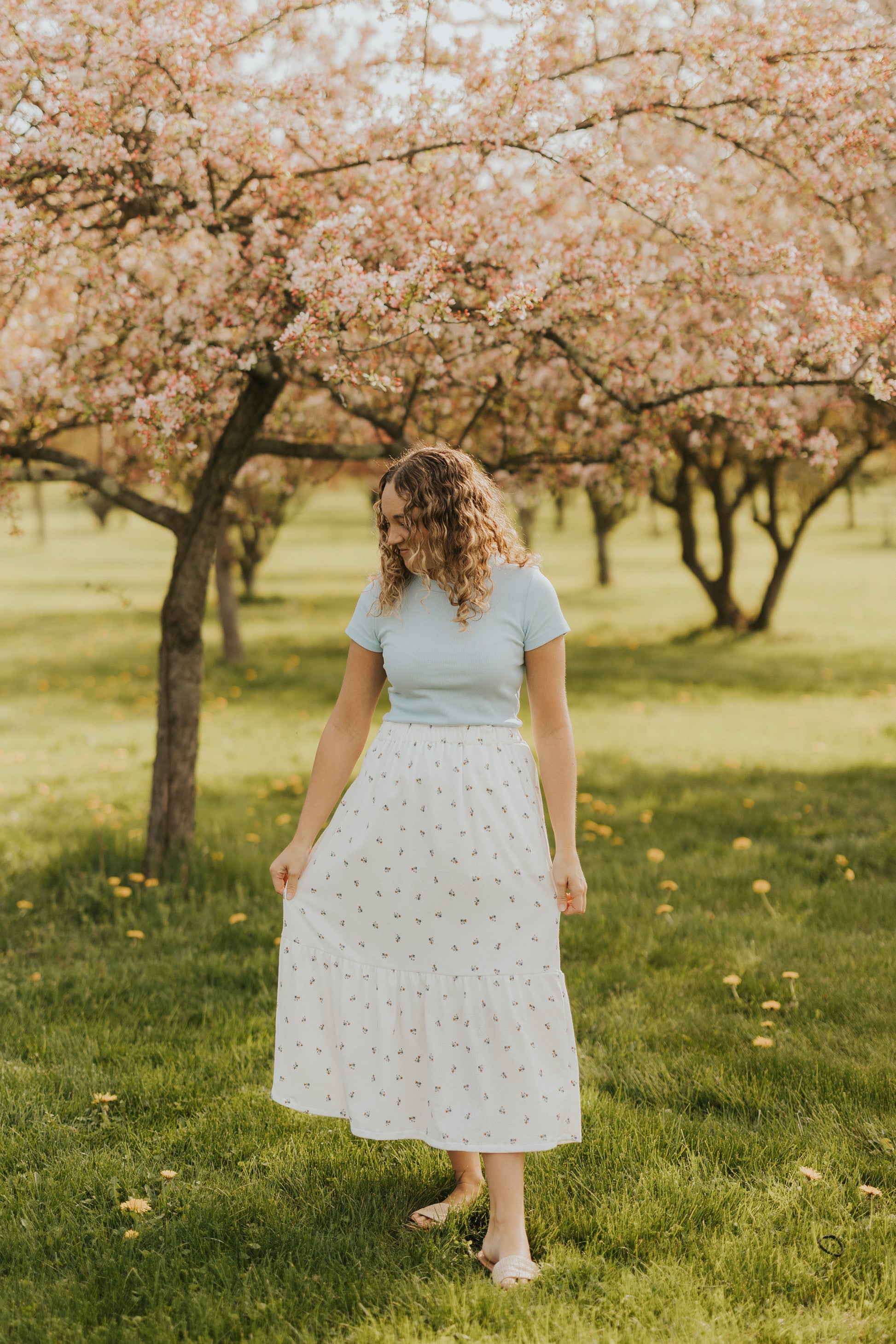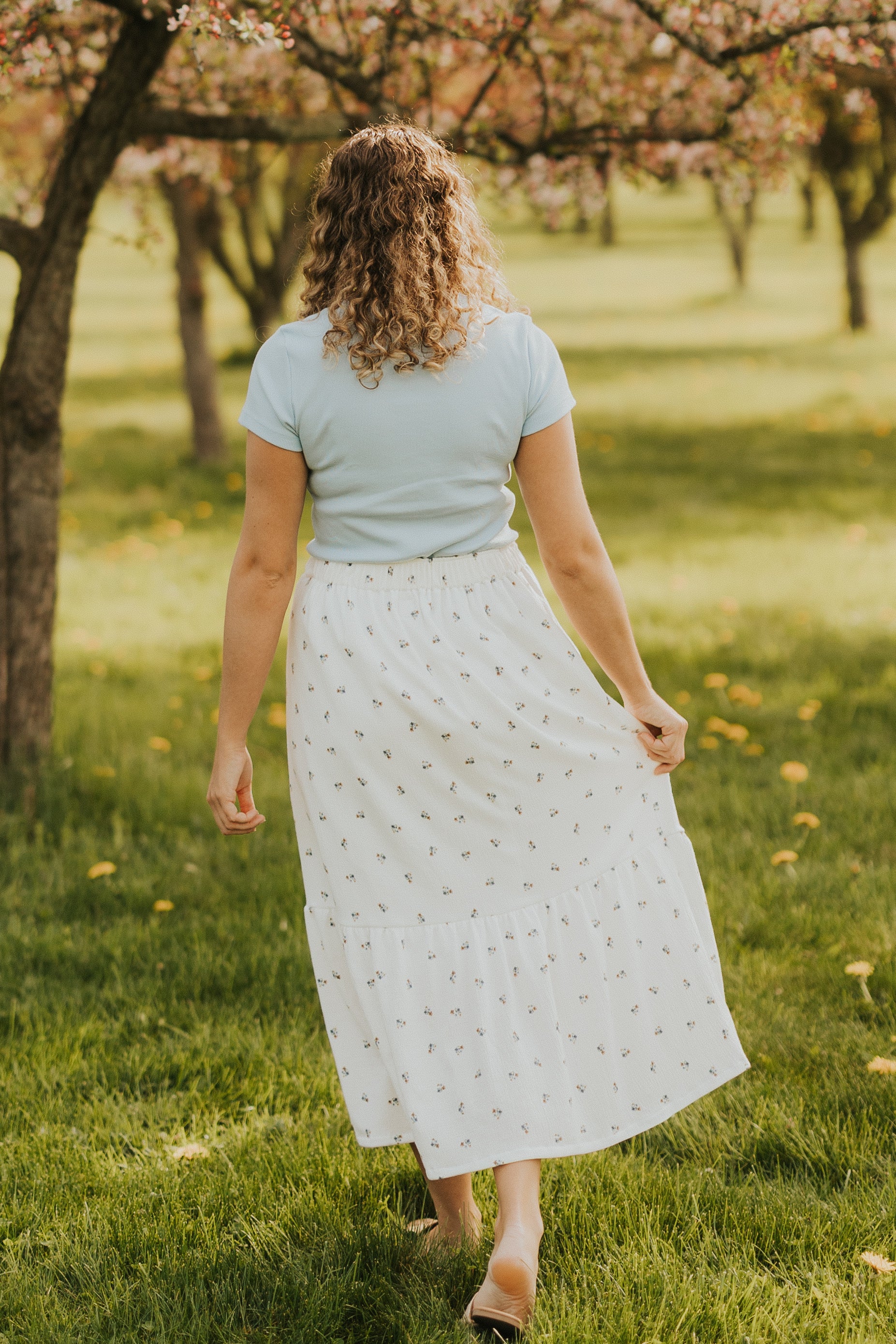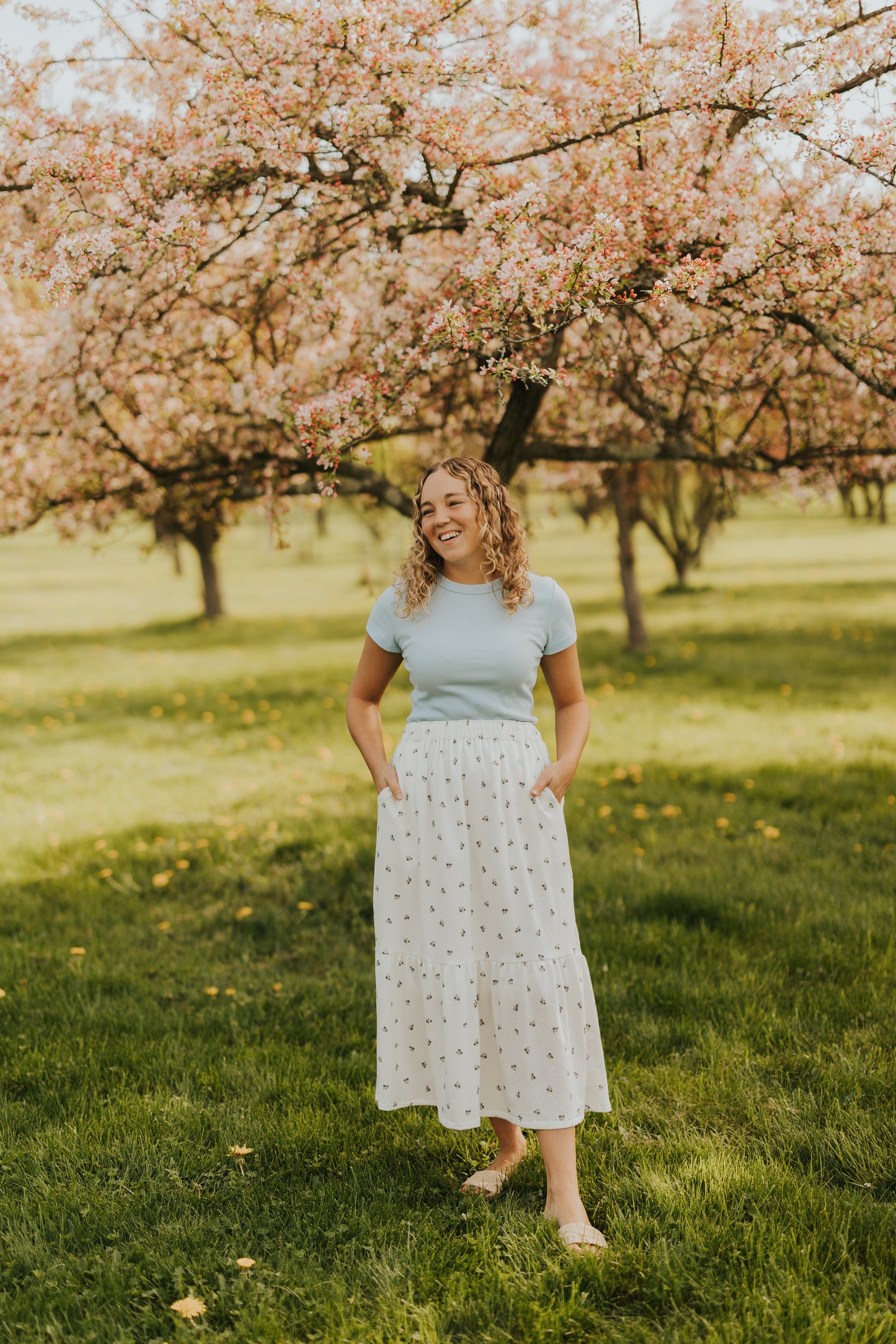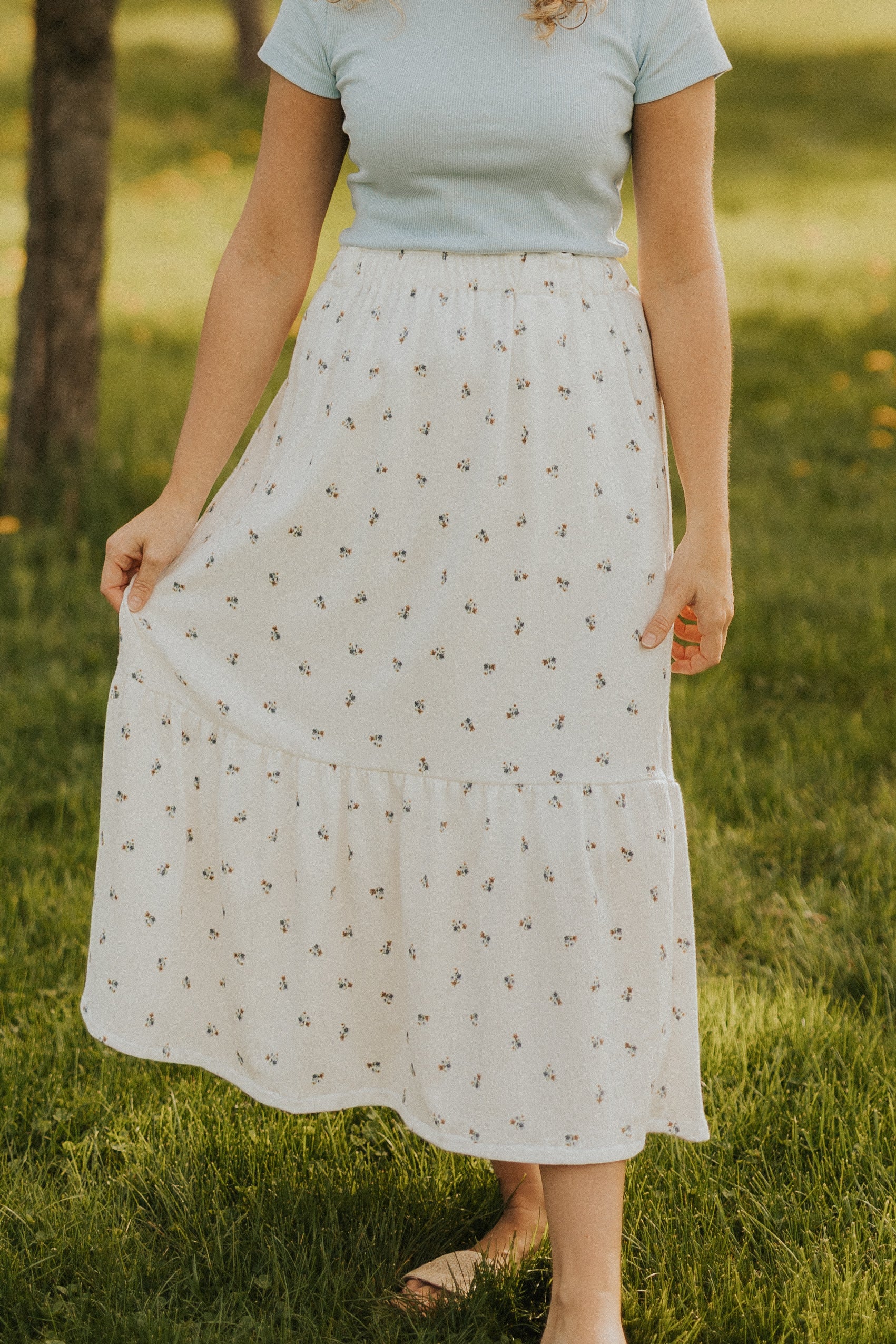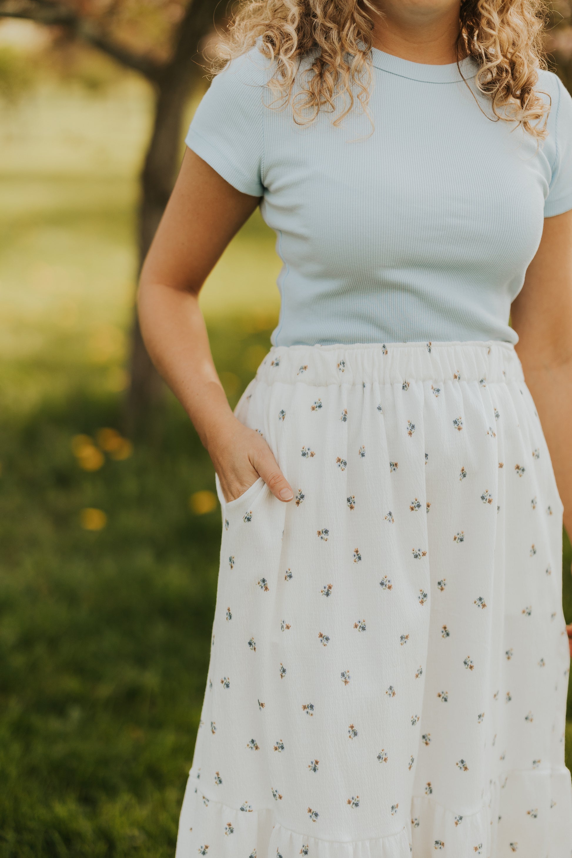 Introducing the Daisy Skirt: made from lightweight gauze for a soft, flowy feel. In a lovely soft blue floral, it boasts a comfortable elastic waistband and functional pockets for all your essentials. Comfort and style in one package - you'll wear it everywhere! This skirt has a 100% white cotton lining.