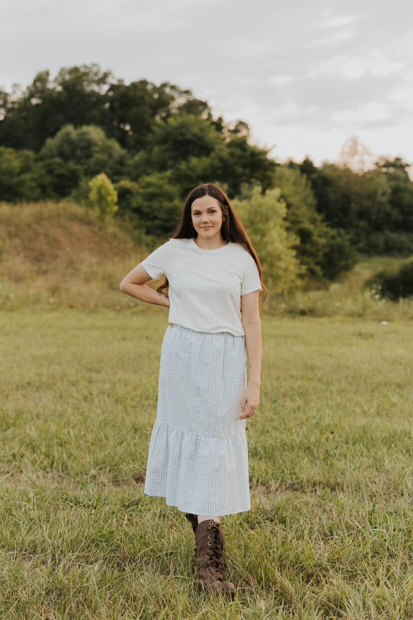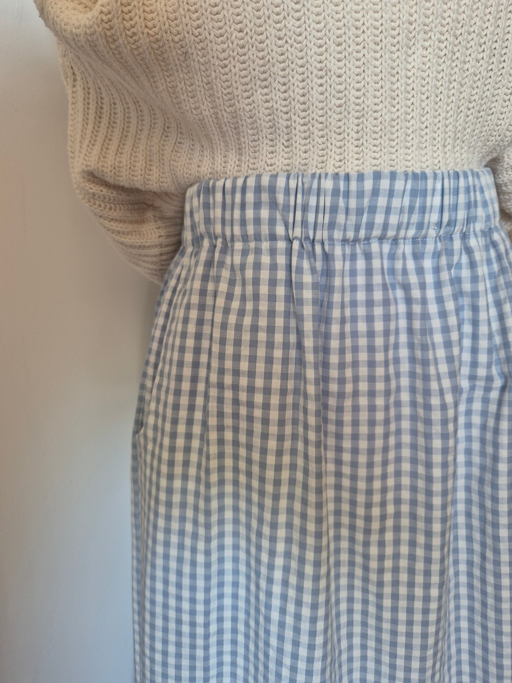 Introducing the Daisy Skirt: made from lightweight cotton for a soft, flowy feel. In a lovely soft blue gingham, it boasts a comfortable elastic waistband and functional pockets for all your essentials. Comfort and style in one package.