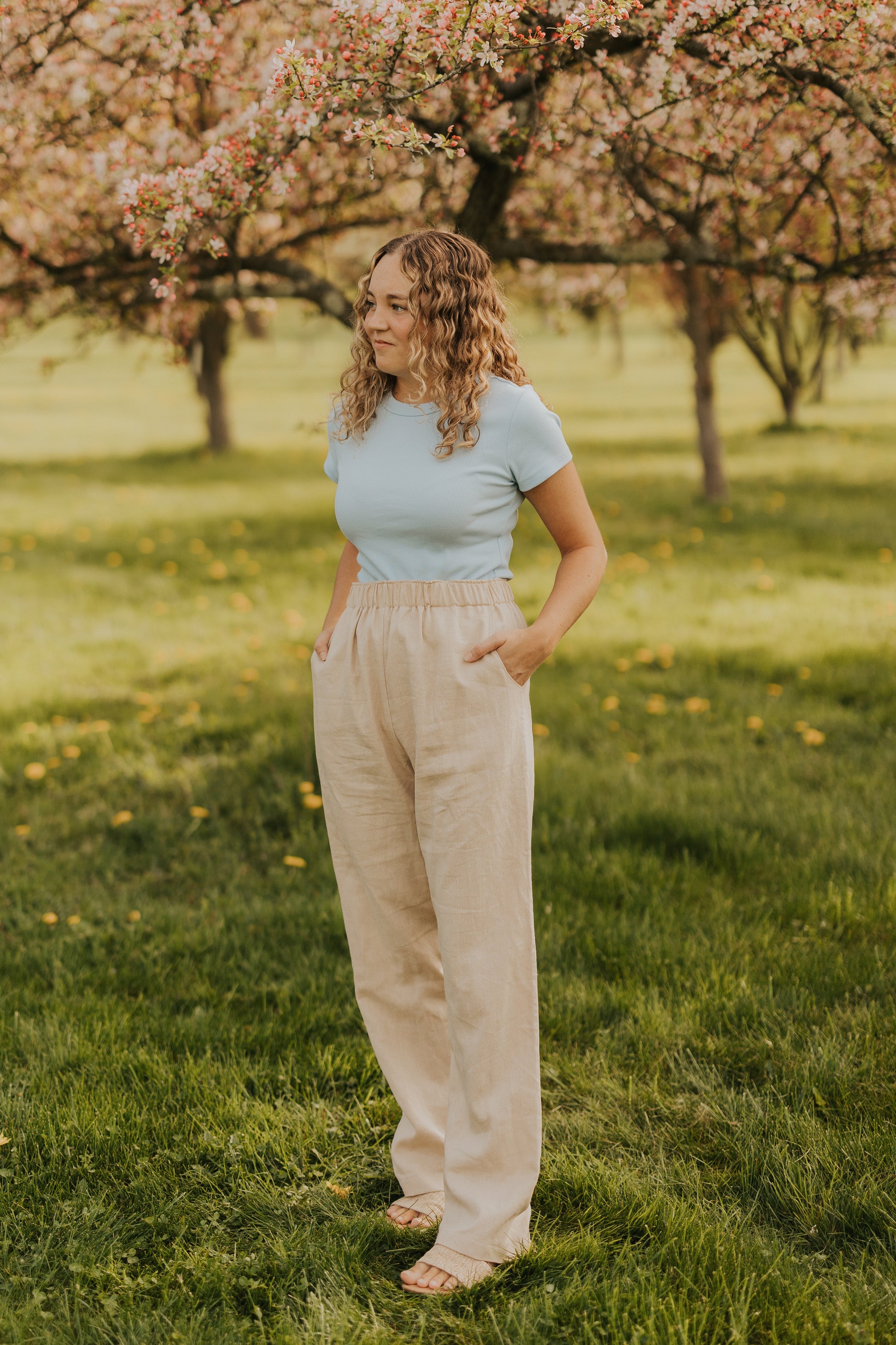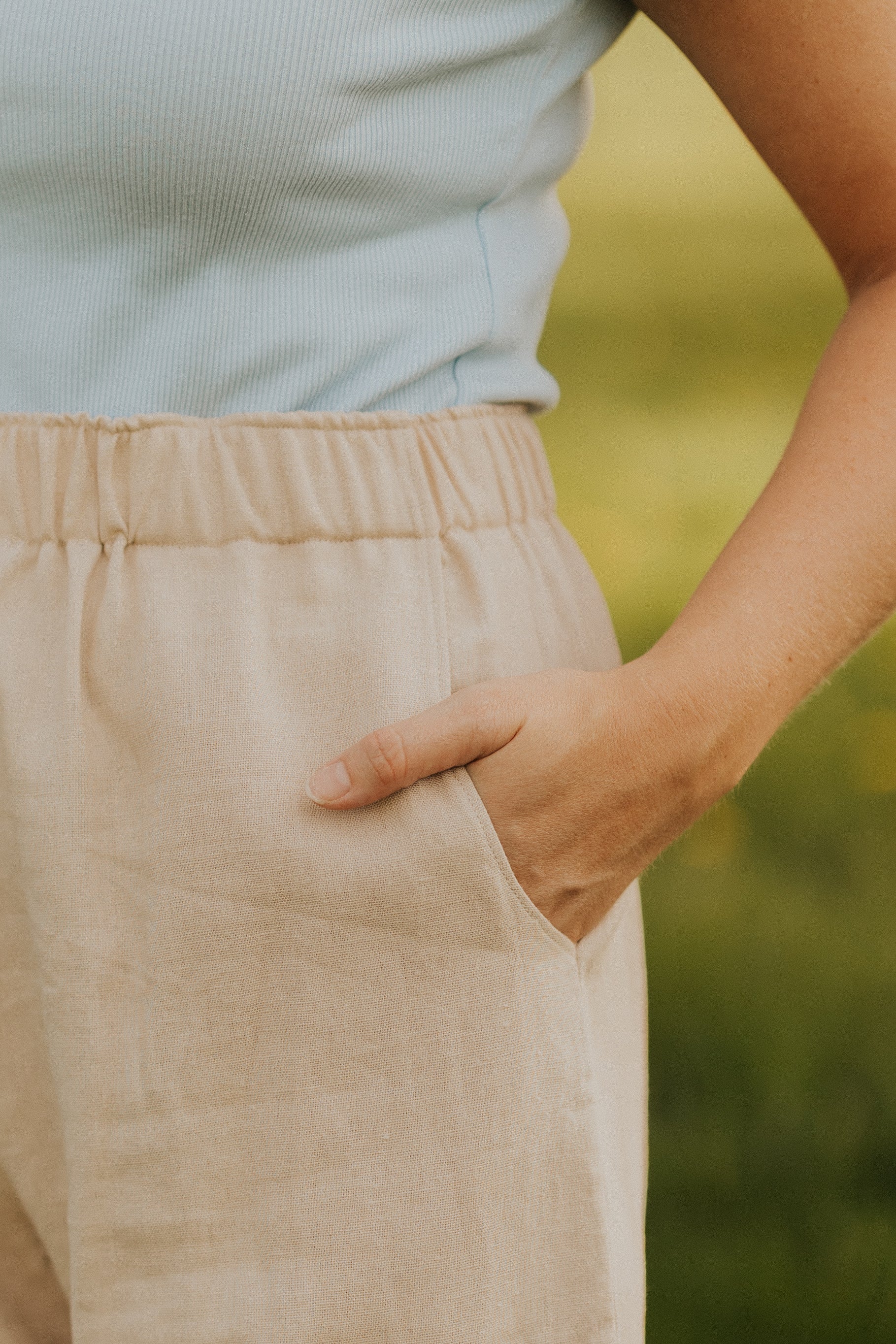 Crafted with a linen look, these pants exude sophistication and style. The comfortable elastic waistband ensures a perfect fit, while the pockets provide added convenience. Elevate your wardrobe with these sleek pants.