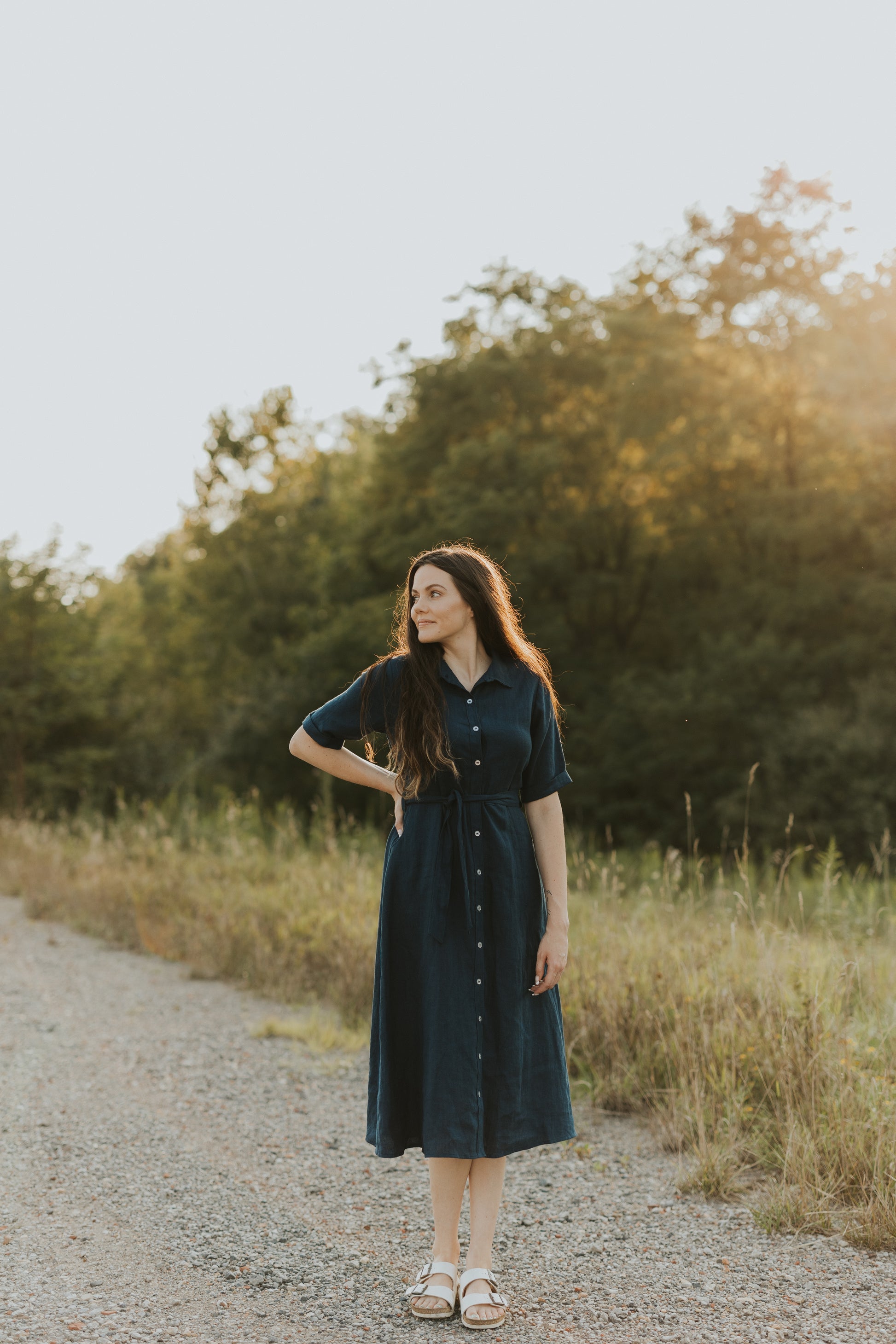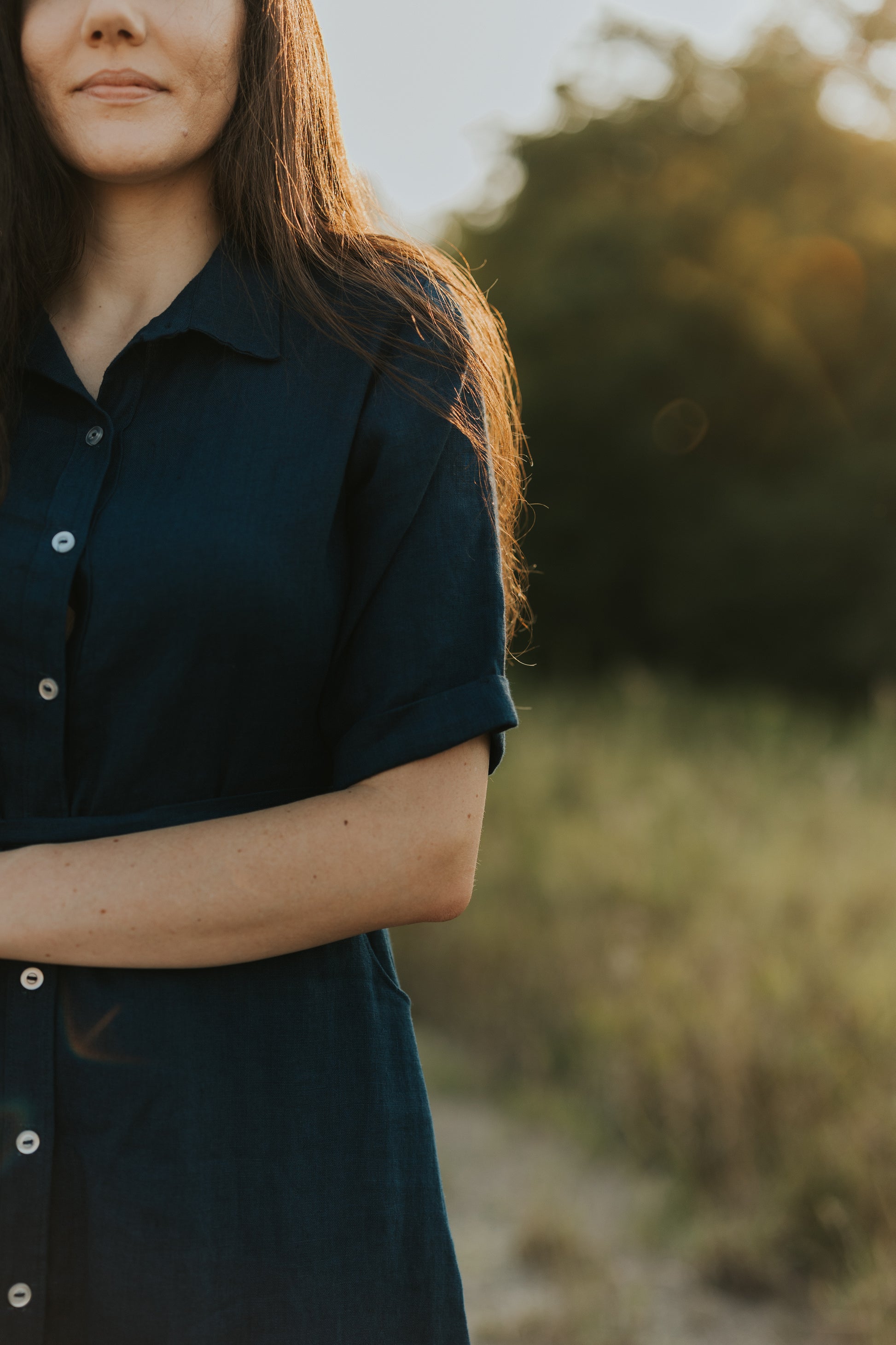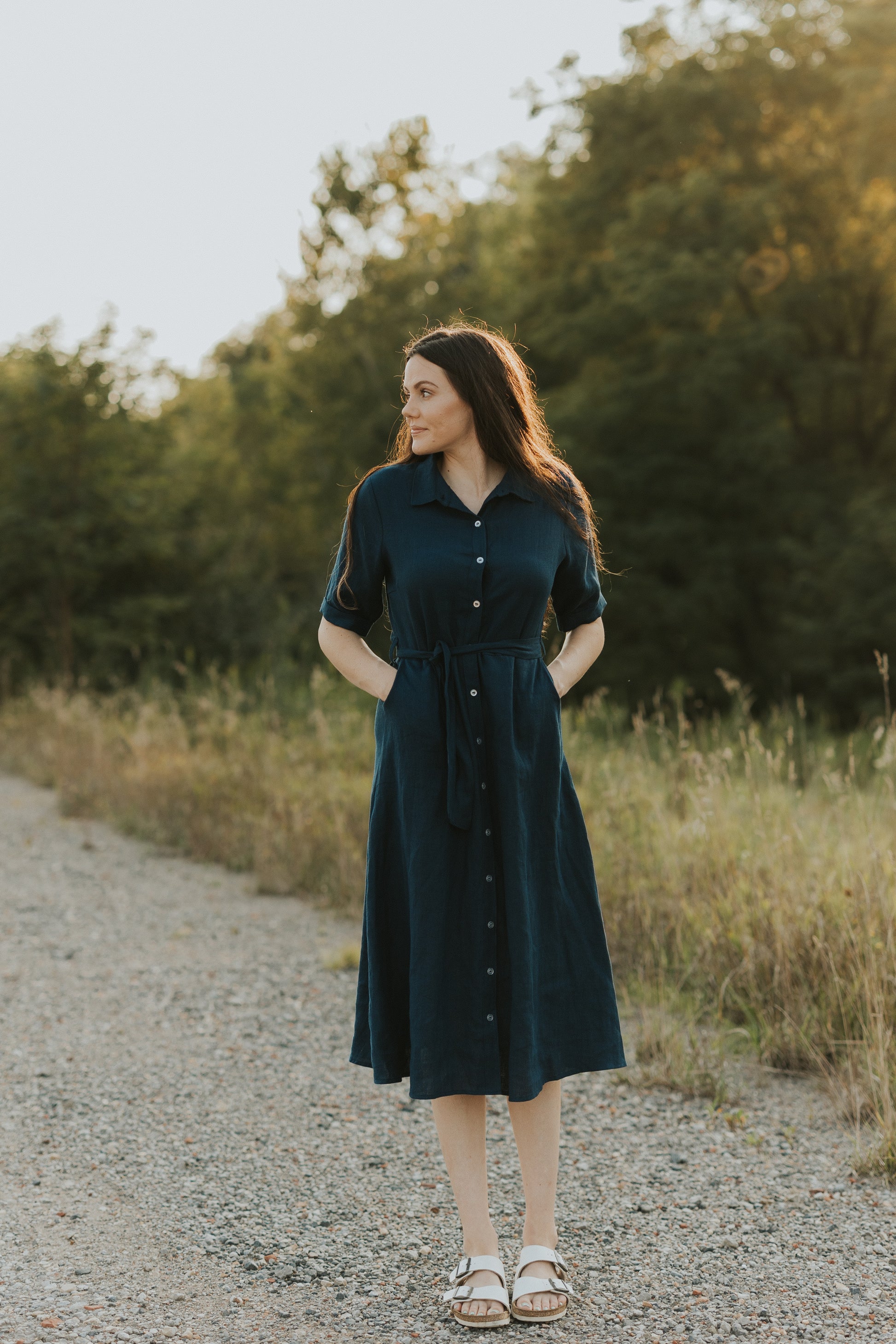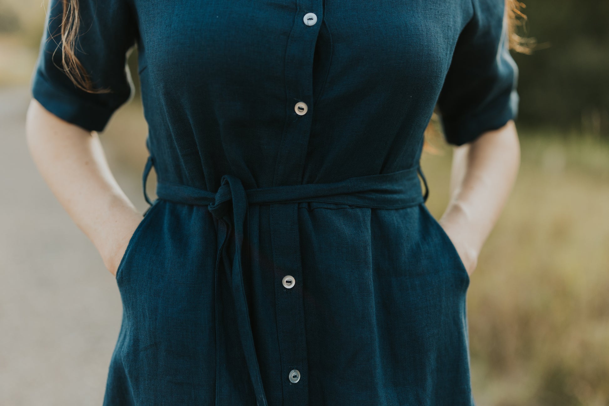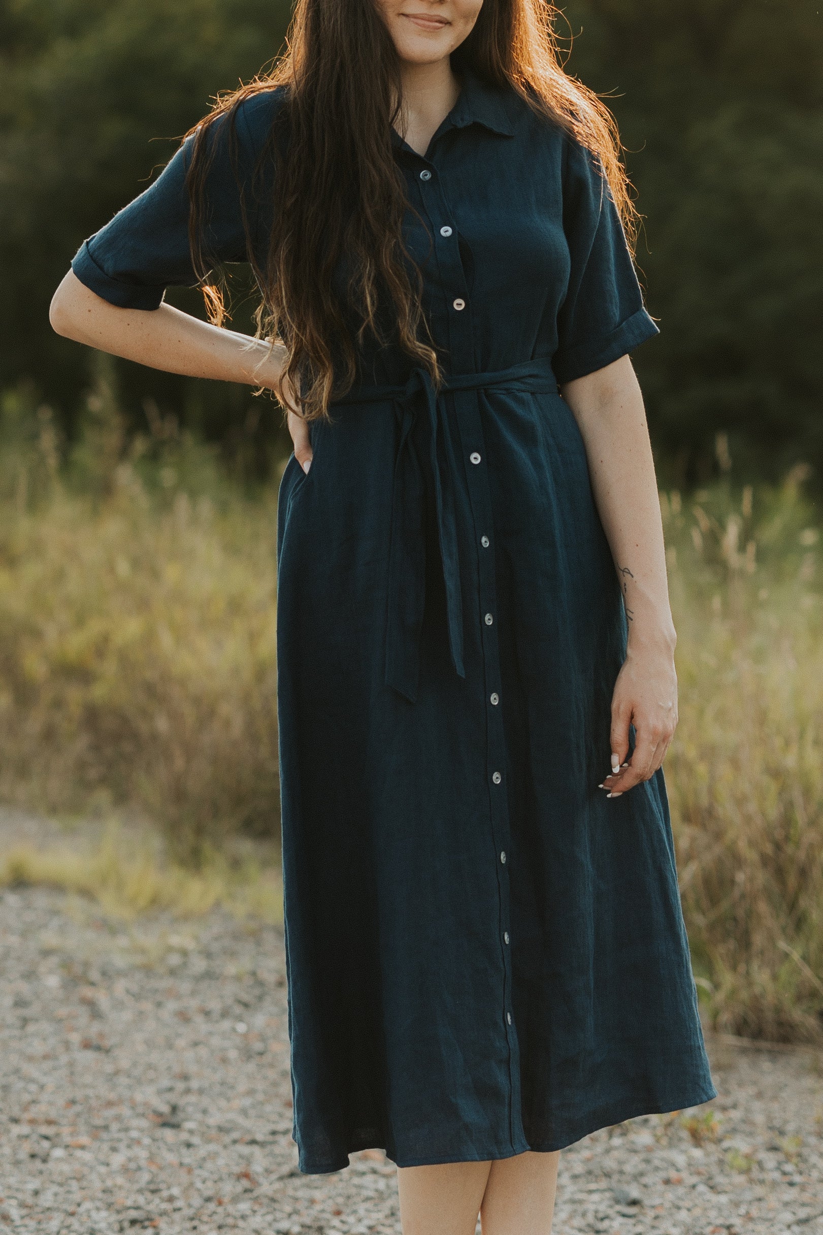 The Rebecca Dress is a stylish collared shirt dress in navy blue. Made of softened, high quality, Lithuanian linen, it offers comfort and breathability for all-day wear. The included belt cinches at the waist for a flattering silhouette, while the practical pockets and button details add functionality. Look polished and put-together in this versatile dress.