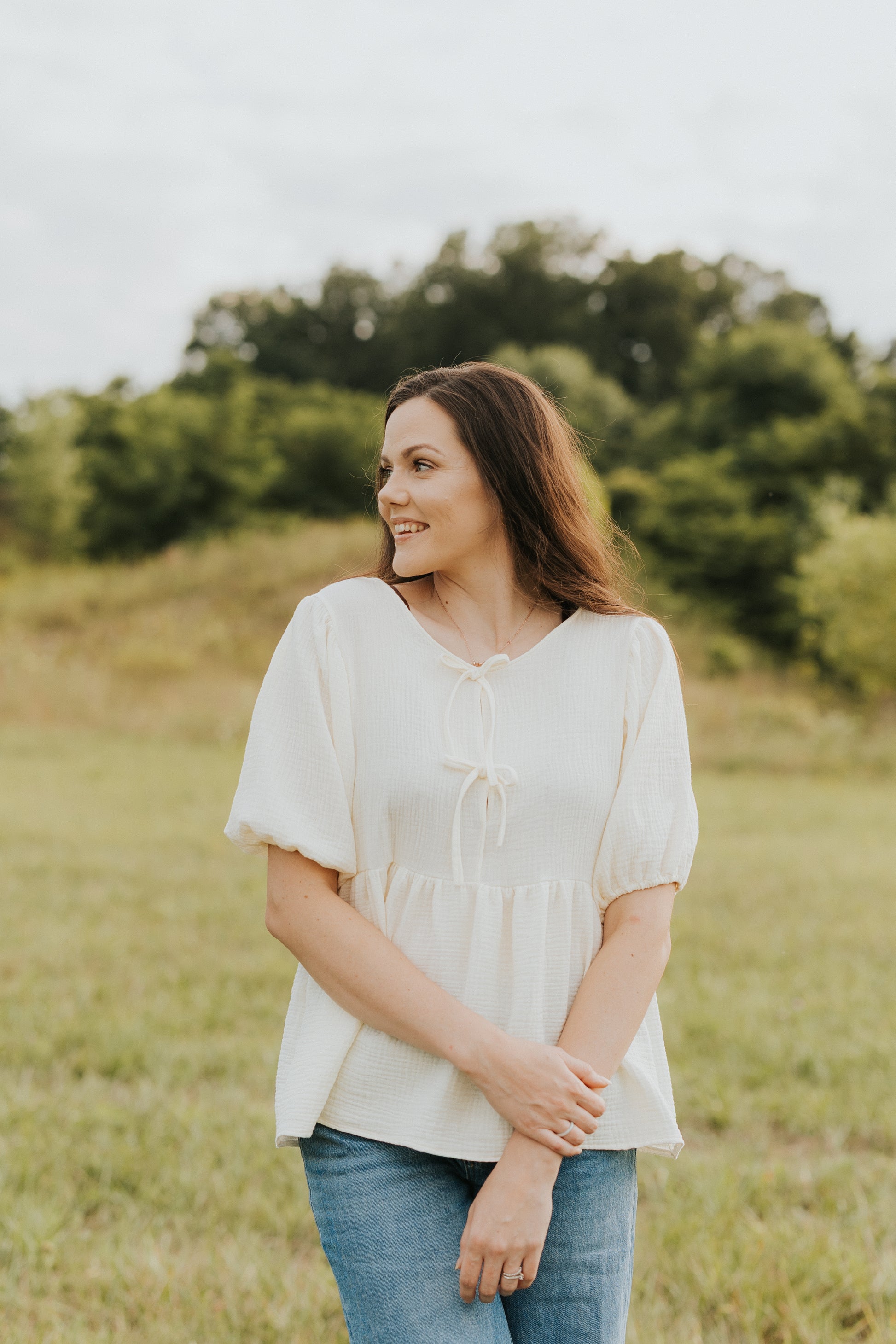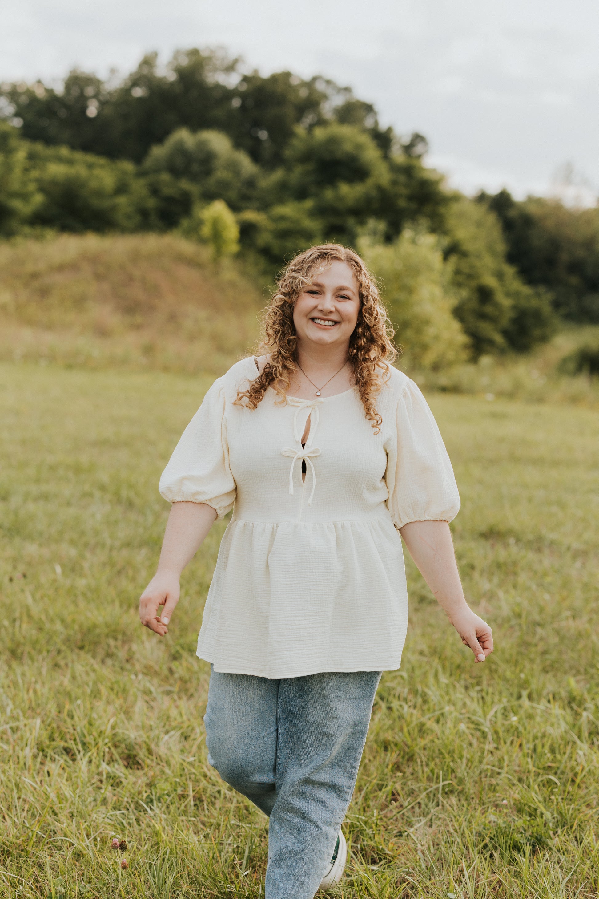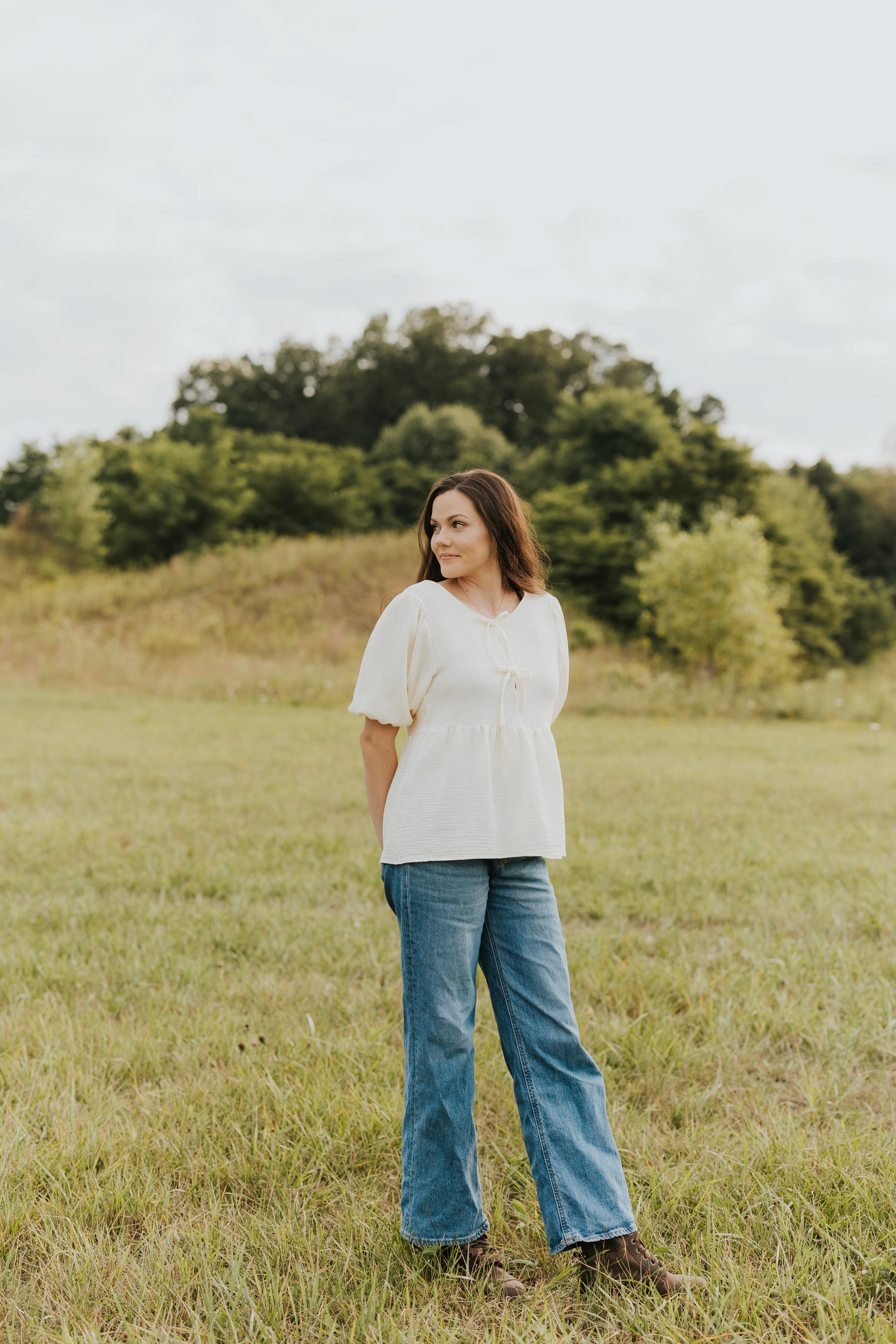 The Sophia Blouse is a cute and practical addition to your wardrobe, made from soft double cotton gauze for a light, airy feel. Adorned with cute bows and featuring easy snap closures. Its flowy shape ensures comfort and a flattering fit.
